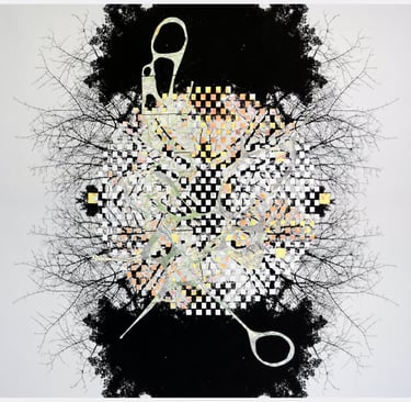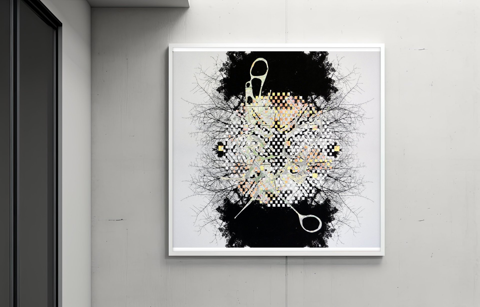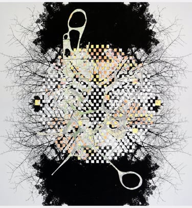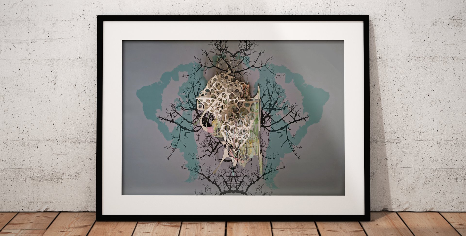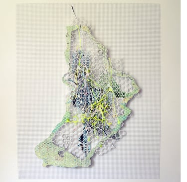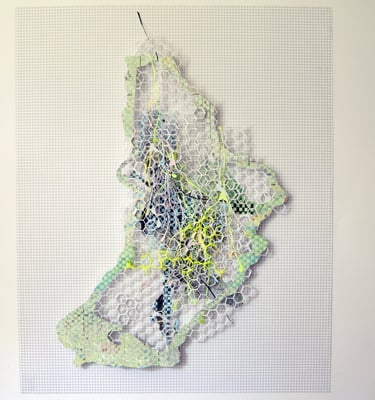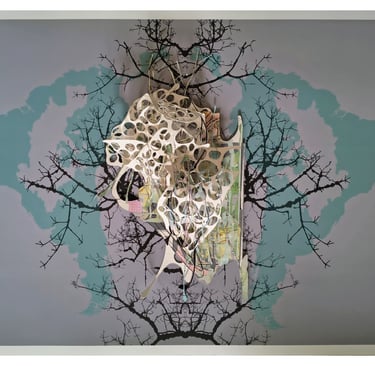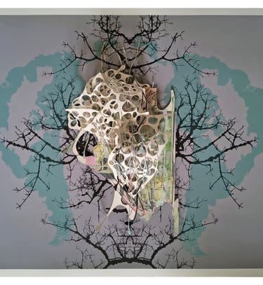 Three-dimensional artwork designed for wall display, made of hand-woven and assembled paper.